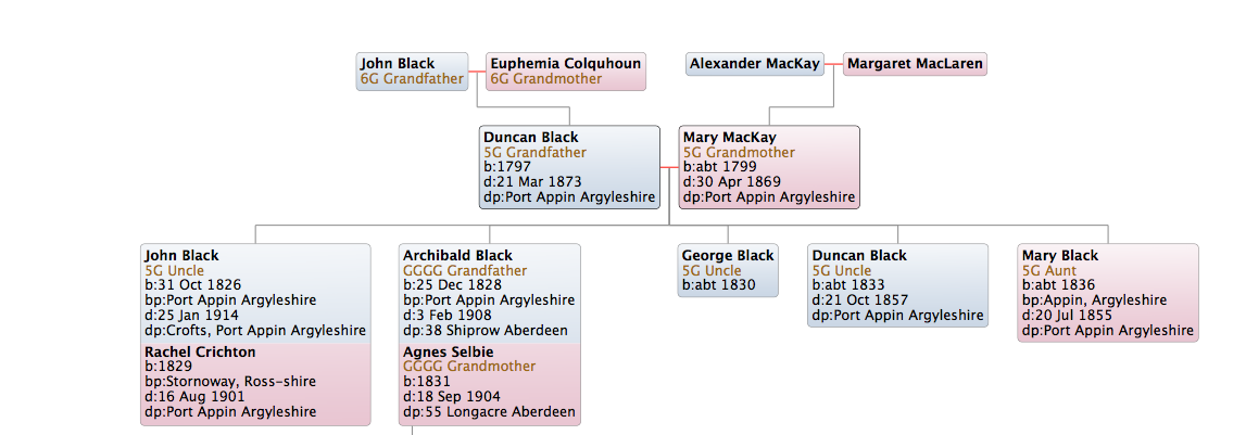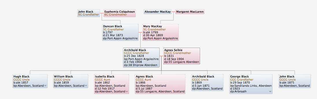 My source for this information is principally Scotlands People for birth, death, marriage and census records.  However I am also indebted to a user on Family Search who has added a Black genealogy which has helped to point the way towards some of the children of Archibald and Agnes and other generations of Blacks.  The family tree for Archibald and Agnes is shown in the attachment (click to open in new window).