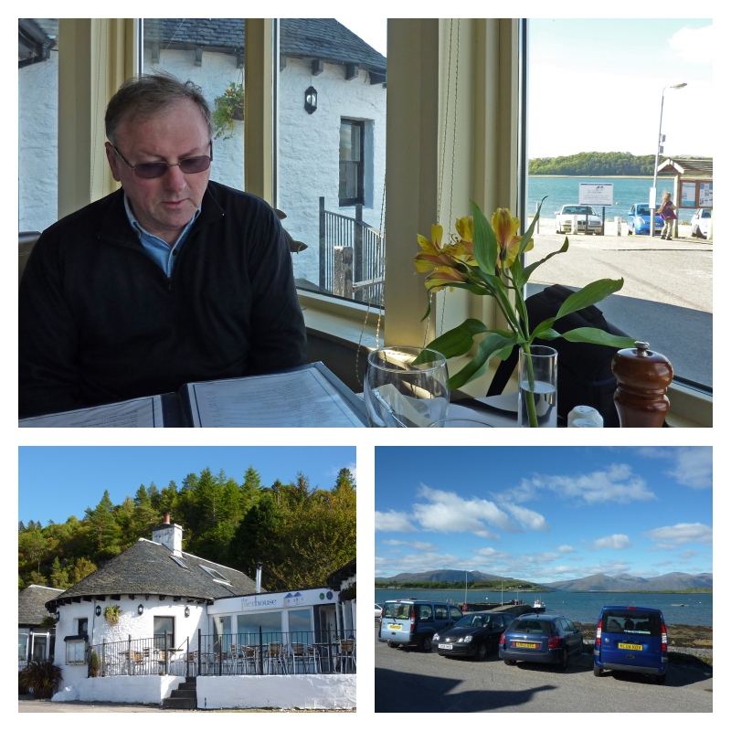 PierHouse Hotel and view from its restaurant at Port Appin; view to the island of Lismore from Port Appin