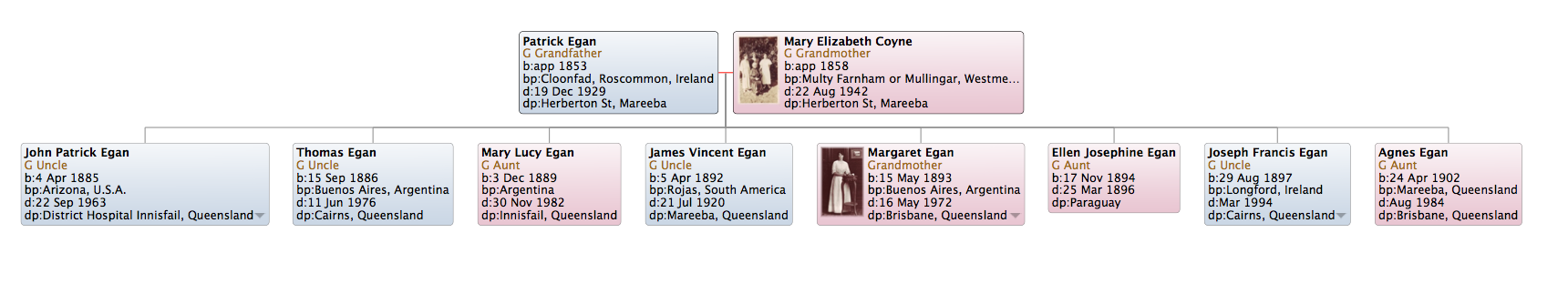 Jim (James Vincent) Egan was my grand uncle, and Mrs Mary Egan, my great-grandmother. While the Egan family did live in the United States – Patrick Egan and Mary (Maria) Coyne were married in Philadelphia in 1883 – they also spent time in South America before returning to Ireland briefly and then migrating to North Queensland.